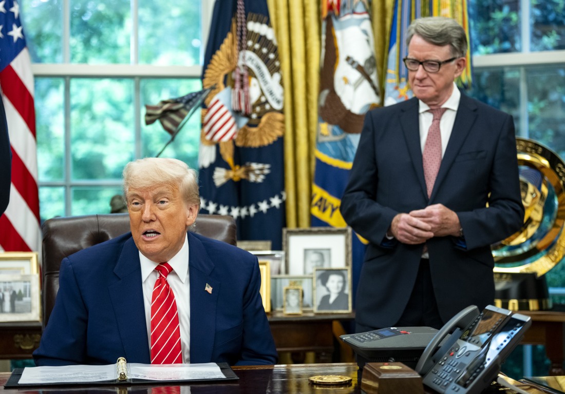 - Ambassador of the United Kingdom to the United States Peter Mandelson, right, looks on as US President Donald Trump announces a trade agreement between the United States and the United Kingdom in the Oval Office of the White House Featuring: President Donald Trump, Peter Mandelson Where: Washington, District of Columbia, United States When: 08 May 2025 Credit: Bonnie Cash/POOL via CNP/INSTARimages.com