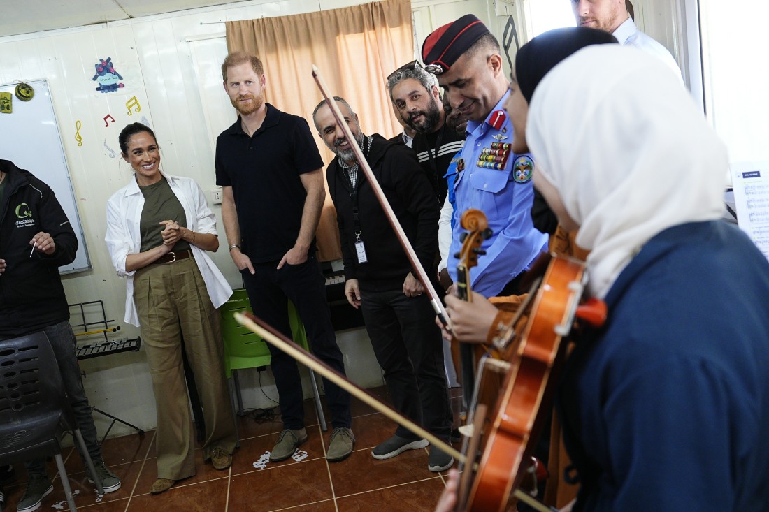 - The Duke and Duchess of Sussex listen to a music class during a visit to the QuestScope Youth Center at the Za’atari refugee camp, home to displaced Syrians, near Mafraq in northern Jordan. Featuring: Prince Harry, Duke of Sussex, Meghan, Duchess of Sussex Where: Mafraq, Jordan When: 25 Feb 2026 Credit: Aaron Chown/PA Images/INSTARimages **NORTH AMERICA RIGHTS ONLY**
