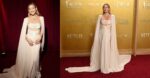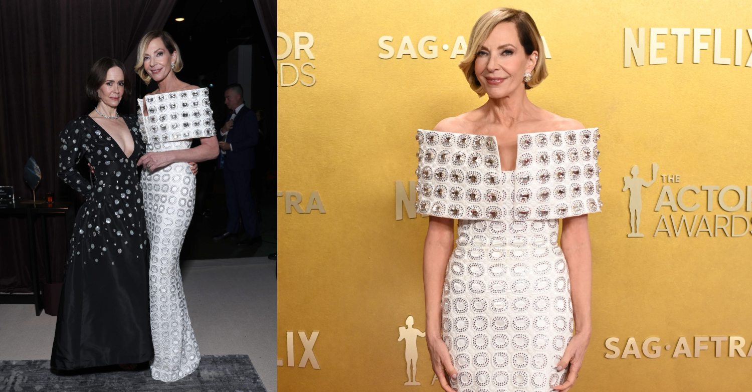 Presenter Allison Janney was in a cream Raisa Vanessa column gown with circular embellishments and a bold wrap-like neckline. I loved this gown on camera and found it so striking. I’m including a bonus pic of her posing with Sarah Paulson.