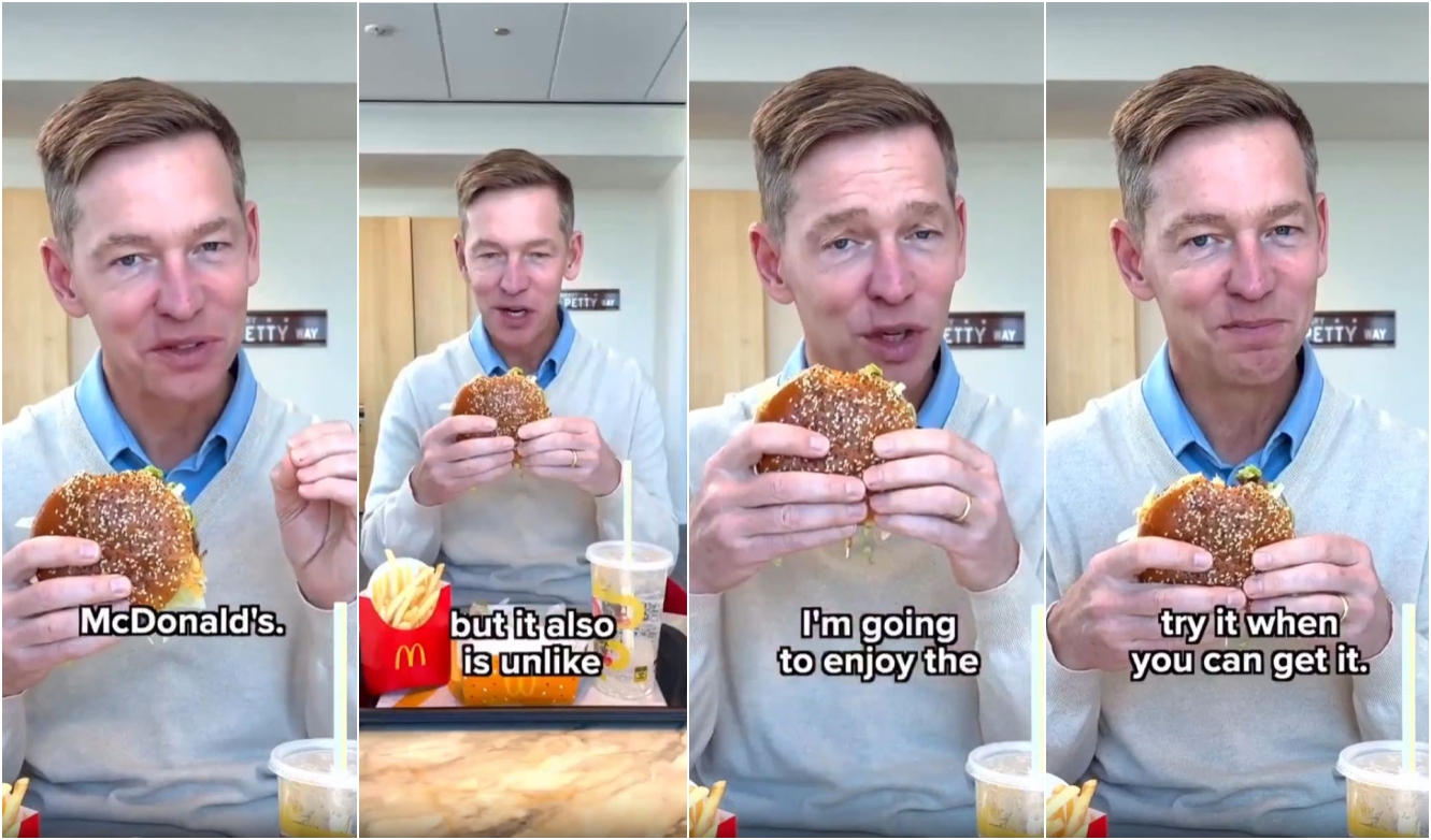 the internet has found its new favorite comedy: McDonald’s CEO Chris Kempczinski attempting to eat the company’s massive new Big Arch burger without actually looking like he wants to eat it. The viral clip, which has been making the rounds on social media, features Kempczinski introducing the beefy newcomer as a “product“—a term usually reserved for shampoo or industrial solvent—before taking a bite so tiny it would make a hamster look like a competitive eater.