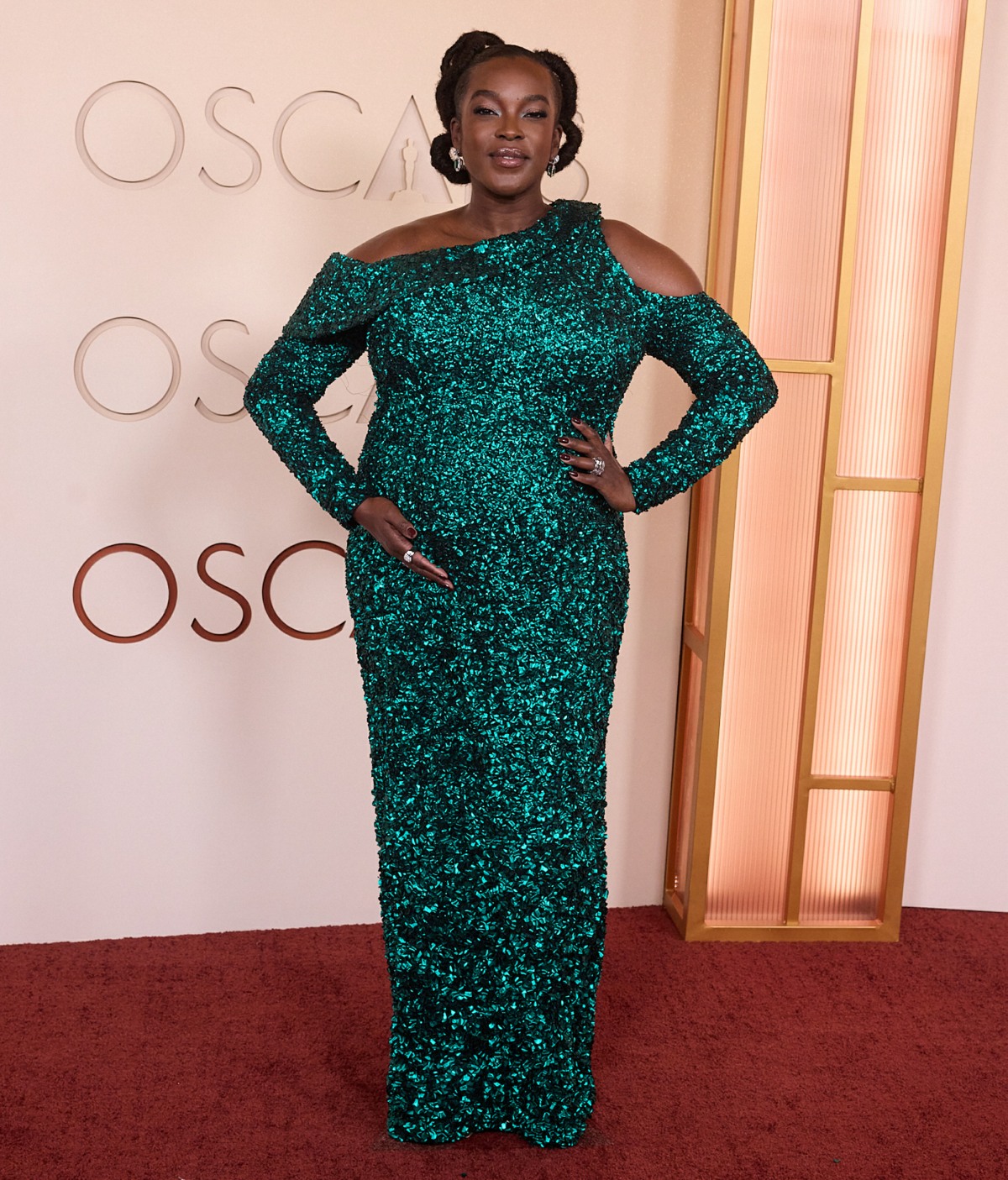 I really hope the GFY team highlights Wunmi’s styling for award season because she’s looked radiant and perfectly-calibrated for each luncheon, appearance, and award show that she attended. She’s stood out not just because of her pregnancy (which was treated as an accessory and not something to hide) and joyful-yet-sophisticated bright colors that enhance her glow. The color of her Oscar gown is perfect – not emerald, not aqua-teal, but a beautiful peacock color that shimmered like peacock feathers due to the sequins. I am not mad that Amy Madigan won but I wanted Wunmi to win because I could not stop thinking about her character after seeing Sinners.