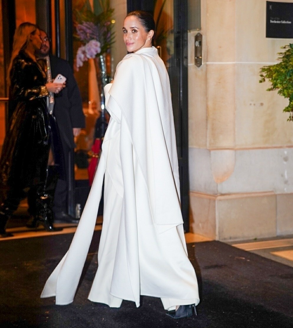 - Paris, FRANCE Meghan Markle was spotted arriving at her hotel after attending the Balenciaga show during Paris Fashion Week, exuding elegance in a white oversized cape over a button-down shirt, paired with black pointed-toe heels and a sleek bun. Pictured: Meghan Markle BACKGRID USA 4 OCTOBER 2025 BYLINE MUST READ: Iammeysam / BACKGRID USA: +1 310 798 9111 / usasales@backgrid.com UK: +44 208 344 2007 / uksales@backgrid.com *UK Clients – Pictures Containing Children Please Pixelate Face Prior To Publication*