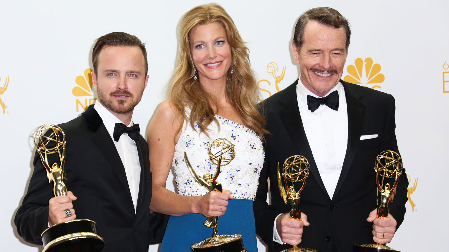 Aaron Paul, Anna Gunn, Bryan Cranston pose in the press room at the 66th Annual Primetime Emmy Awards held at Nokia Theatre L.A. Live in Los Angeles. Los Angeles, California – Monday August 25, 2014.