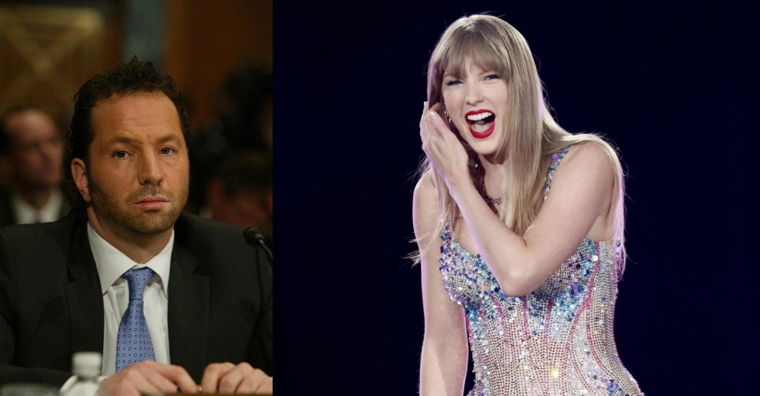 Live Nation President and CEO Michael Rapino testifying in congress in 2009 next to a photo of Taylor Swift smiling during a performance