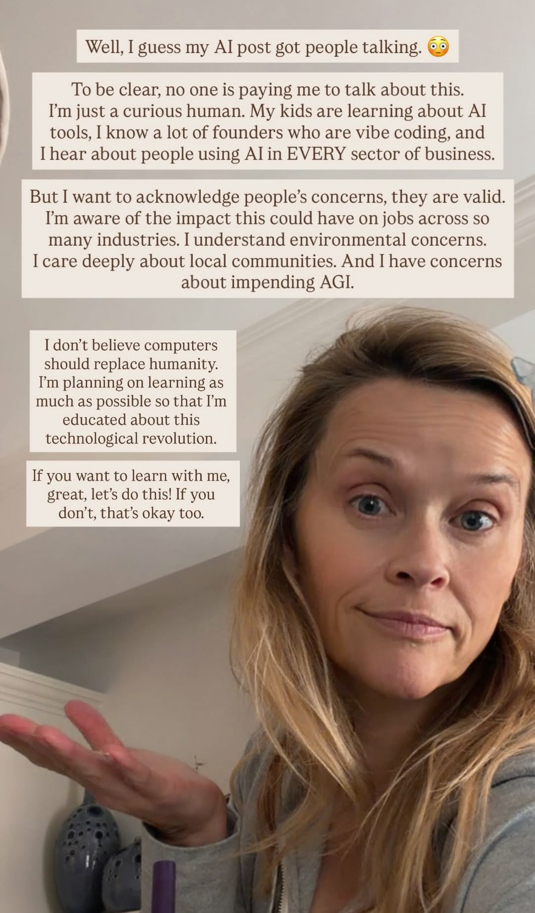 Last week, Reese Witherspoon caused a lot of consternation with a social media post. On Instagram, Reese wrote: “I’ve decided it’s TIME. The AI revolution has begun, and I need to learn as much as I possibly can about AI and share it with all of you. Also, FYI: the jobs women hold are 3x more likely to be automated by AI, yet women are using AI at a rate 25% lower than men on average. We don’t want to be left behind. So…do you want to learn with me?” People were mad, mostly because this AI bullsh-t is idiotic 90% of the time and it’s absolutely making everyone dumber. Reese was seen as trying to promote “girlboss AI” and many believed that her Instagram post was some kind of undercover AI spon-con. Well, Reese has heard all of the criticism and she responded: