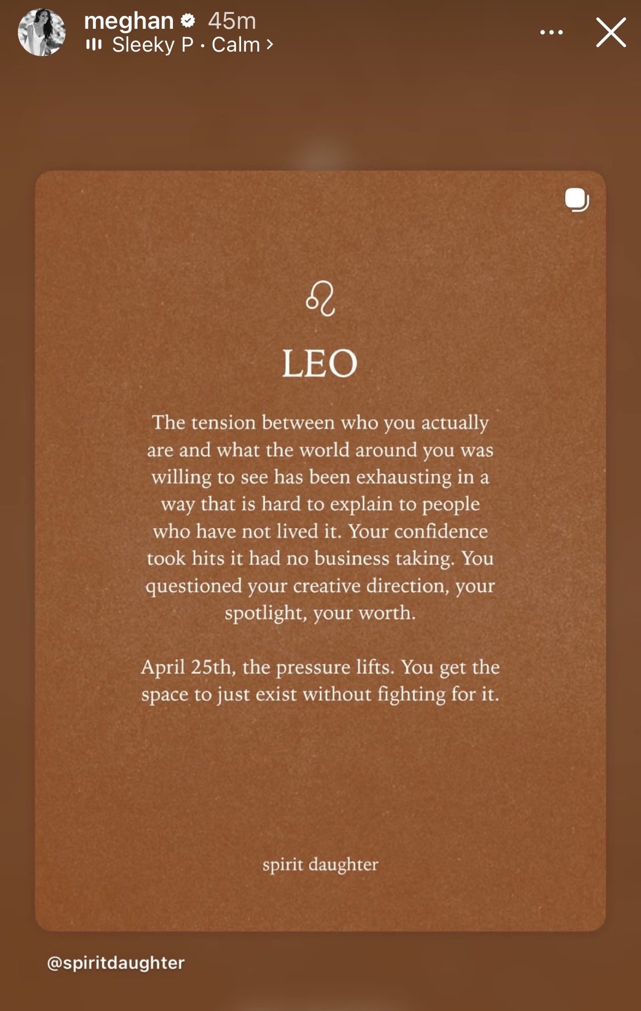 The post featured two men dancing enthusiastically with the words, “Taurus, Leo, Scorpio, & Aquarius ending the hardest seven years of their lives on April 25,” typed across the top. (Meghan, born on Aug. 4, is a Leo.) Earlier the same day, Meghan reshared another astrology-related post from the account spiritdaughter containing her horoscope.
