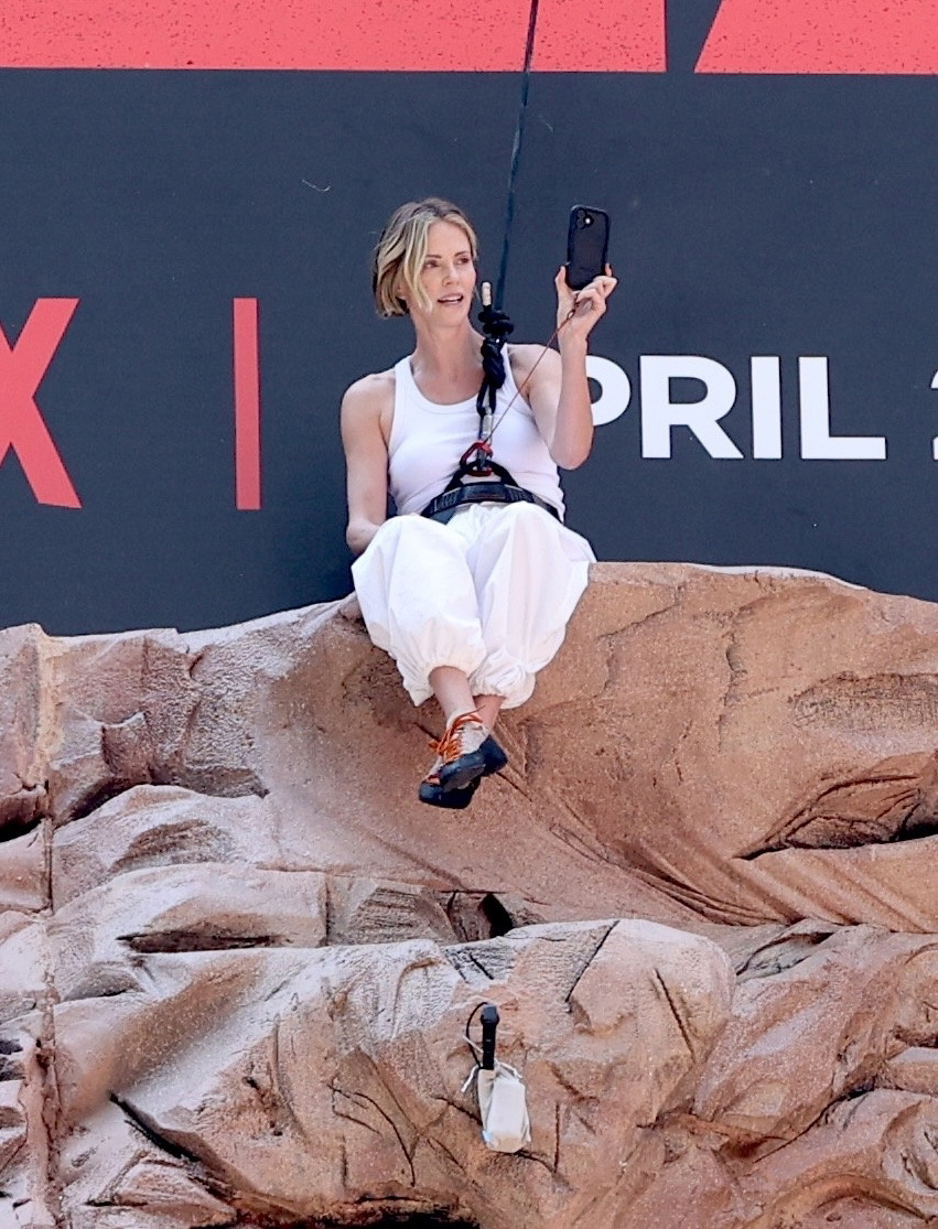 - New York, NY Charlize Theron is spotted climbing a wall to promote her new movie Apex in Times Square, Manhattan. Pictured: Charlize Theron BACKGRID USA 24 APRIL 2026 BYLINE MUST READ: Jose Perez / BACKGRID USA: +1 310 798 9111 / usasales@backgrid.com UK: +44 208 344 2007 / uksales@backgrid.com *UK Clients – Pictures Containing Children Please Pixelate Face Prior To Publication*